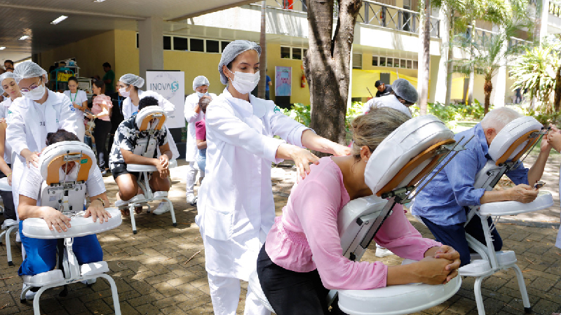 O curso de Fisioterapia levou três serviços distintos ao Inova-S: avaliação da dor cervical e cefaleia, que utiliza acessórios como algômetro e inclinômetro; avaliação da função pulmonar e orientações da síndrome pós-covid; e terapia manipulativa para alívio da dor e movimento com recursos da quiropraxia e osteopatia.