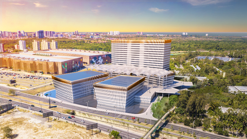 Como atração especial, as fachadas dos dois prédios de frente para a avenida Washington Soares serão as primeiras do Brasil a contar com projeções mapeadas (Imagem: Maquete Digital do Complexo)