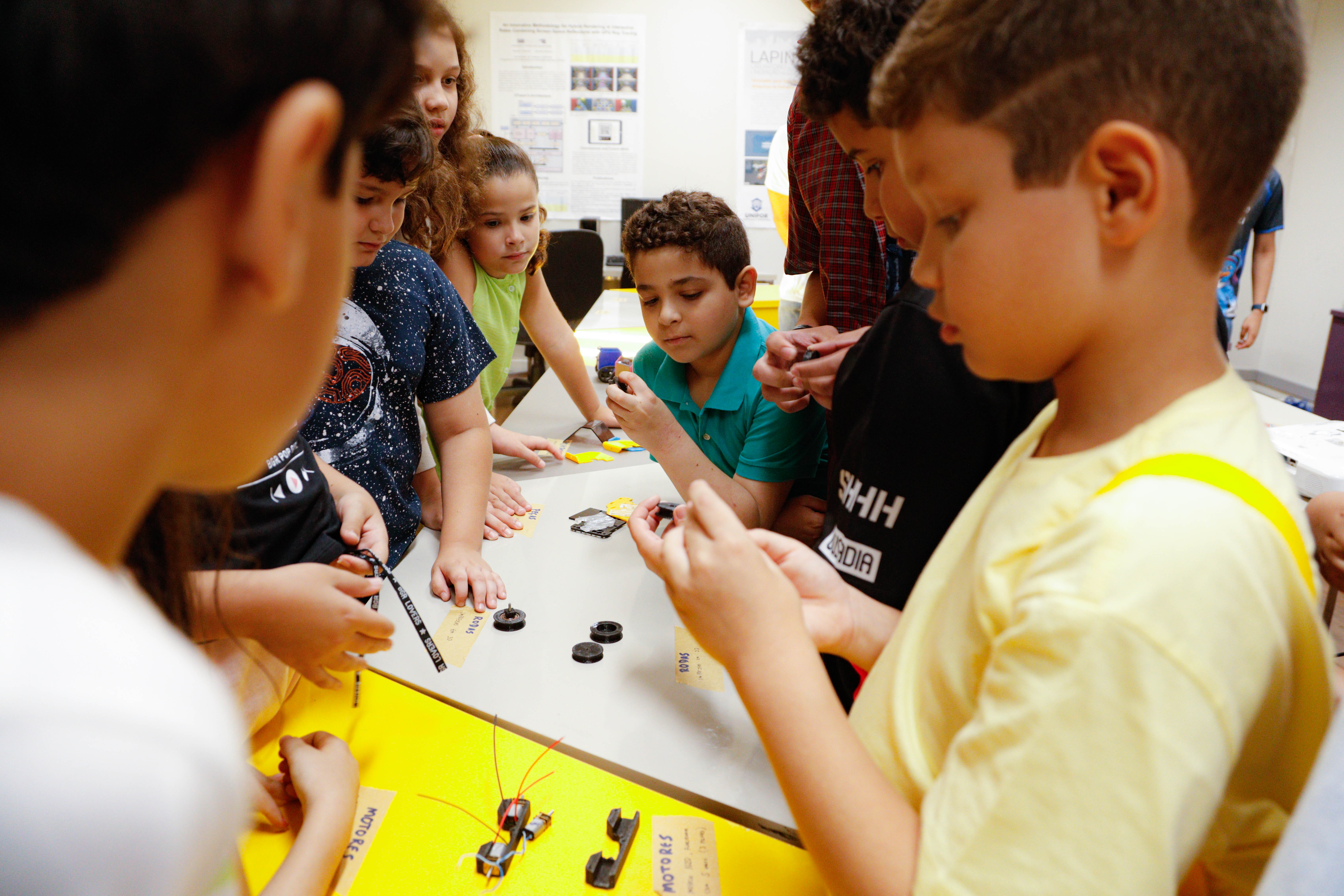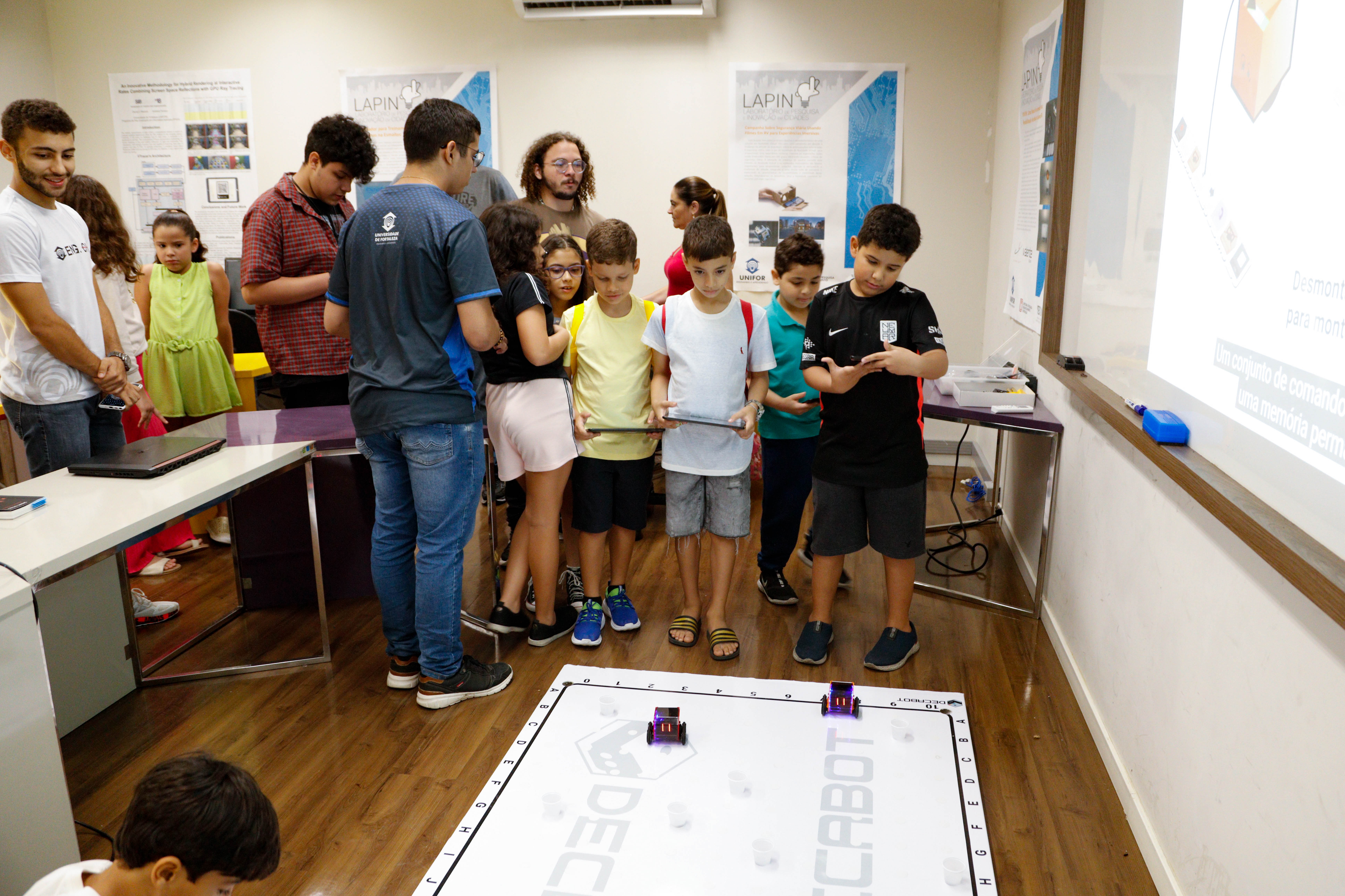 Na visita ao Laboratório de Pesquisa e Inovação em Cidades (Lapin), os pequenos conheceram a área de desenvolvimento de projetos e de robótica, momento que gerou muita empolgação. Segundo o docente da Unifor e coordenador do laboratório, Daniel Chagas, trazer as crianças para a Universidade colabora para que elas compreendam o local como um “ambiente de muita imaginação, onde podem transformar seus desejos em artefatos, programas, jogos ou robôs”.