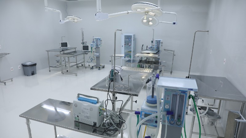 No terceiro prédio, o central, há quatro centros cirúrgicos: três deles voltados para animais domésticos e um para animais de produção (bovinos, equinos, suínos etc), além de laboratórios e diagnóstico por imagem. Todos os espaços dispõem de instalações adequadas para os serviços e cumprem as normas e regulamentações exigidas para a realização das atividades.