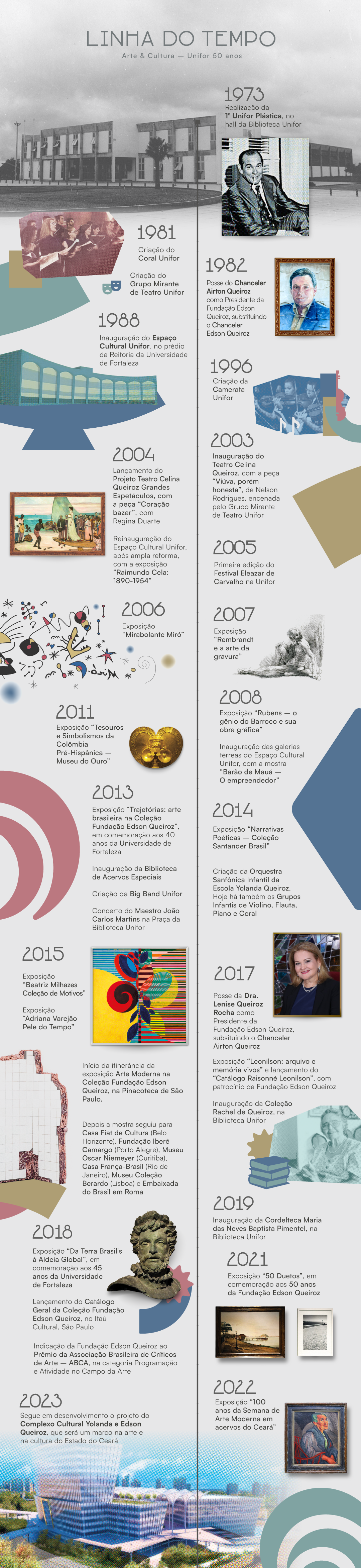 Como poucas instituições no Brasil fora do eixo Rio-São Paulo, a Fundação Edson Queiroz construiu amplo acervo de arte brasileira, sobretudo do século 20, com obras de artistas do porte de Lygia Clark, Tarsila do Amaral, Di Cavalcanti, Lasar Segall, Hélio Oiticica, Candido Portinari, Alfredo Volpi, entre outros. A articulação entre a educação superior e as artes faz parte da essência da Fundação Edson Queiroz, mantenedora da Universidade de Fortaleza (Unifor), onde a comunidade acadêmica convive em harmonia com as artes visuais, o teatro, a música e a dança, por meio da realização de exposições, espetáculos e do apoio permanente a seus grupos de arte – Big Band, Camerata, Cia. de Dança, Coral, Grupo Mirante de Teatro e Grupos Infantis de Sanfona, Flauta, Violino e Piano.