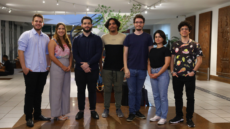Pesquisadores juniores e discentes da Universidade de Fortaleza, da esquerda para direita: Thiago Praça, Beatriz Gomes, Yuri Nekan, Jorge Lins, Bruno Abreu, Rebeca Girão e Lucas Alves (Foto: Ares Soares)