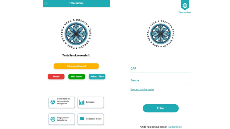 Para utilizar o aplicativo, o usuário precisa fornecer alguns dados (nome, CPF, e-mail e senha) para criar o cadastro. Após uma customização baseada em dados fornecidos pelo user, as interfaces das telas seguintes abordam a carga tabágica ao qual o usuário já foi exposto, por meio de algumas perguntas, como: “quantos maços de cigarro você fuma por dia?”, “há outros fumantes na sua família?”, “você participa de algum programa antitabagismo oficial?”, entre outras.
