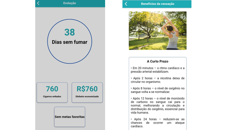 Também é disponibilizado um relatório com gráfico de progresso, que vai melhorando à medida que os dias passam. Além disso, mostra o dinheiro que é possível economizar. Ele então cria metas e mostra os benefícios delas. “Ou seja, o aplicativo sempre vai dando um feedback e direcionando para a cessação do tabagismo”, pontua.